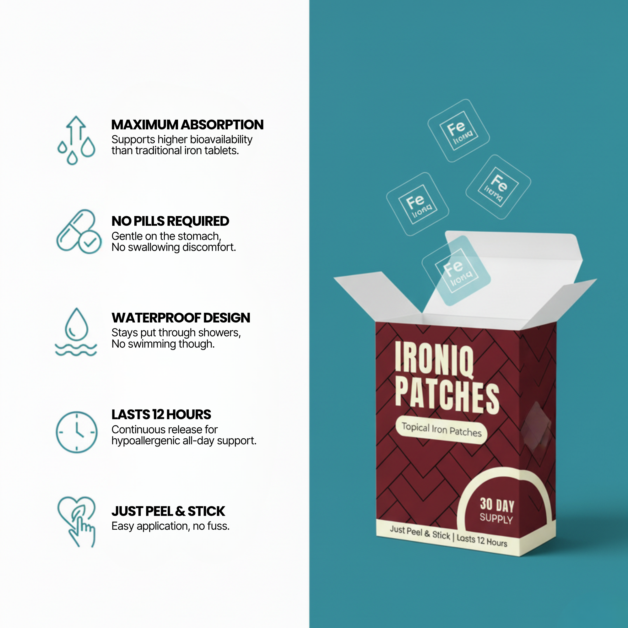 Each patch provides up to 12 hours of gradual iron absorption for balanced energy all day long.